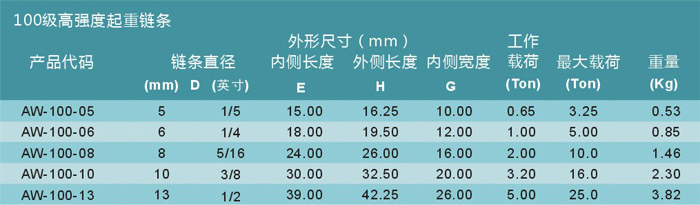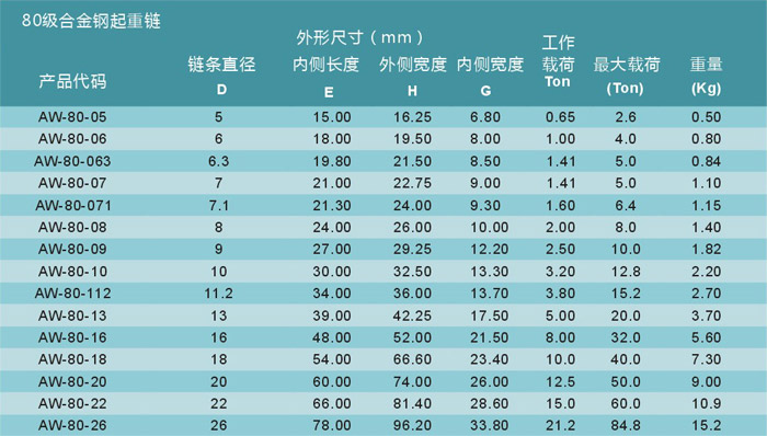 艾培爾AW-8型80級高強度起重鏈參數:
